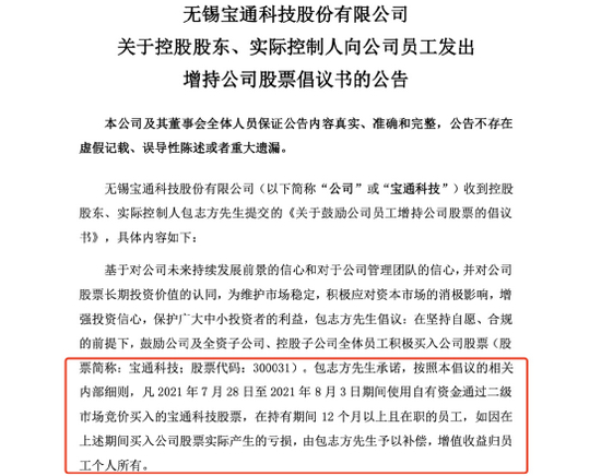 宝通科技董事长包志方先生承诺,按照本倡议的相关内部细则,凡2021年7月28日至2021年8月3日期间使用自有资金通过二级市场竞价买入的宝通科技股票,在持有期间12个月以上且在职的员工,如因在上述期间买入公司股票实际产生的亏损,由包志方先生予以补偿,增值收益归员工个人所有。