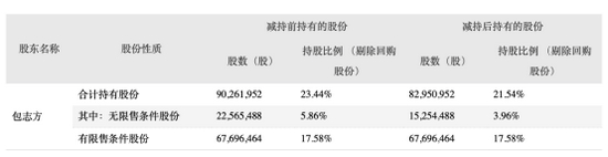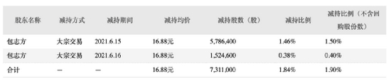 这也就是说,包志方两日共计减持公司股份731.1万股,减持股份均价为16.88元/股,套现1.23亿元。减持后,包志方的持股占比为21.54%。