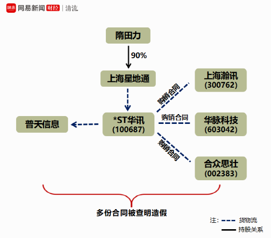 经河北证监局查明,*ST华讯虚构多起购销交易,而这些贸易链条中还牵涉到上海瀚讯(300762)、华脉科技(603042)及合众思壮(002383)多家上市公司。