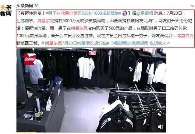 消费者不仅买空直播间,更是从线上转战到线下。相关媒体报道7月23日,一男子在鸿星尔克线下店内购买了500元的产品,结账时扫码付款1000元转身就跑,遭到店员全网寻找。