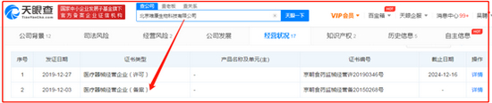 然而,天眼查发现,唯康生物的《医疗器械经营许可证》2019年12月初才备案,2019年年底才获得许可。