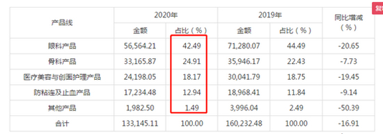 从2020年业务收入结构看,其基本盘是眼科,医美相关产品收入不到两成。从增速可以看出,昊海生科业务2020年全线下降,其中医美与眼科都在20%左右。