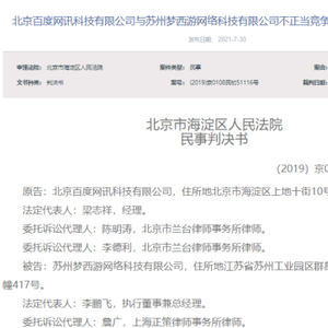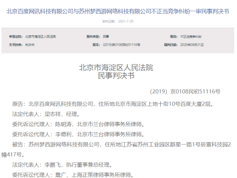 最终,法院判决结果为:本判决生效之日起十日内,被告苏州梦西游网络科技有限公司自判决生效之日起十日内赔偿原告北京百度网讯科技有限公司经济损失200万元及合理开支3万元等。