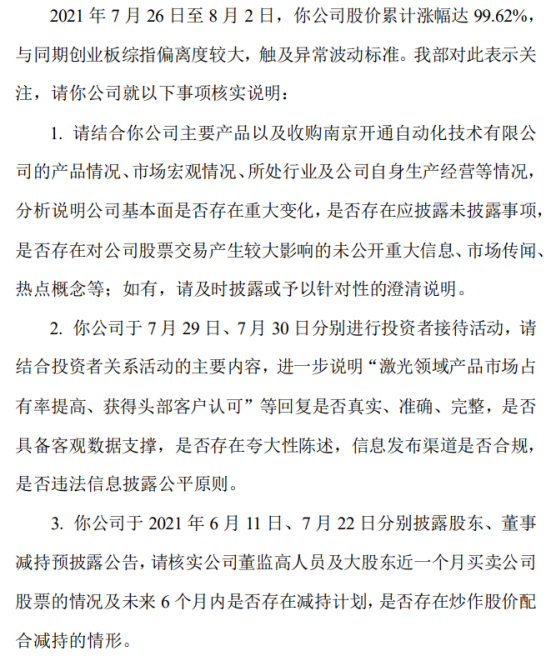 深交所8月2日晚间向维宏股份下发关注函称,要求结合投资者关系活动的主要内容,进一步说明“激光领域产品市场占有率提高、获得头部客户认可”等回复是否真实、准确、完整,是否具备客观数据支撑,是否存在夸大性陈述。分析说明公司基本面是否存在重大变化,是否存在应披露未披露事项,是否存在对公司股票交易产生较大影响的未公开重大信息、市场传闻、热点概念等。