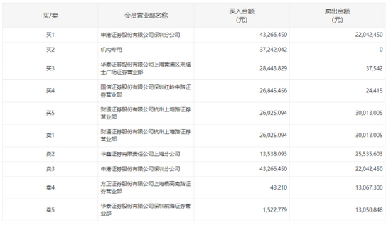 盘后数据显示,一机构专用席位净买入3724万元;申港证券股份有限公司深圳分公司买入4326.6万元,卖出2204万元。