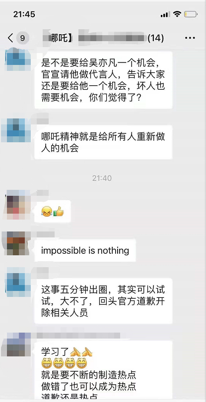 8月3日晚间,一张疑似哪吒汽车工作群的聊天记录截图传出。图片显示,群里的某些成员发布消息讨论要不要官宣请吴亦凡做代言人。