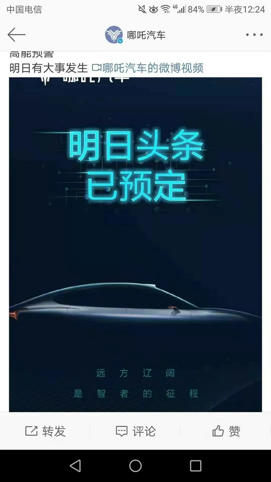 8月3日下午,哪吒汽车官方微博称,“高能预警,明日有大事发生”。附有一辆新车的部分外观视频。视频的结尾,哪吒汽车宣布:“明日头条已预订”。该预热的反响平平,微博上只有不到3000次观看。