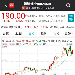 进入8月,赣锋锂业股价在本周前3个交易日经历宽幅震荡,今日收盘涨8.45%,报收于190元/股。今年以来,赣锋锂业累计涨幅已有88%,公司最新市值2731亿元,居稀有金属行业市值第一。