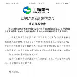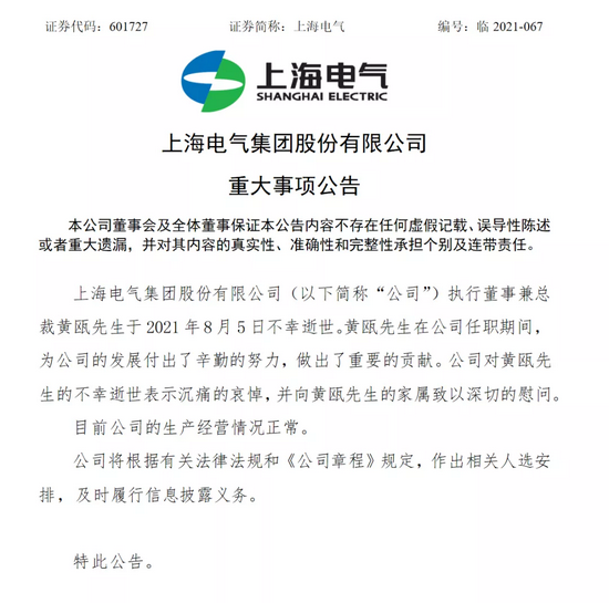 8月5日下午,A股上市公司上海电气发布公告称:执行董事兼总裁黄瓯先生于当天不幸逝世。