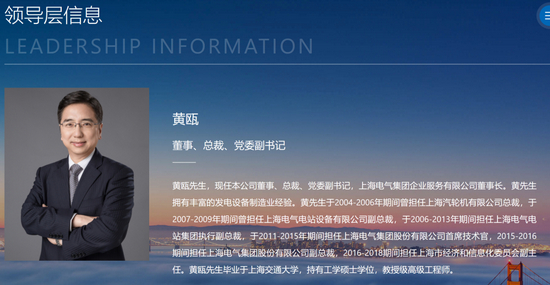 黄瓯先生,现任本公司董事、总裁、党委副书记,上海电气集团企业服务有限公司董事长。黄先生拥有丰富的发电设备制造业经验。黄先生于2004-2006年期间曾担任上海汽轮机有限公司总裁,于2007-2009年期间曾担任上海电气电站设备有限公司副总裁,于2006-2013年期间担任上海电气电站集团执行副总裁,于2011-2015年期间担任上海电气集团股份有限公司首席技术官,2015-2016期间担任上海电气集团股份有限公司副总裁,2016-2018期间担任上海市经济和信息化委员会副主任。黄瓯先生毕业于上海交通大学,持有工学硕士学位,教授级高级工程师。