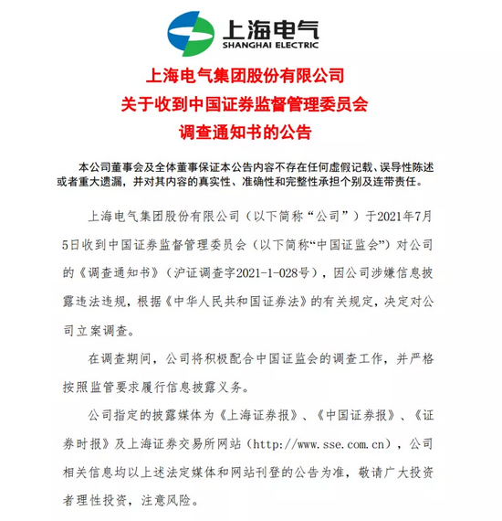 7月5日晚,上海电气发布关于收到中国证券监督管理委员会调查通知书的公告。
