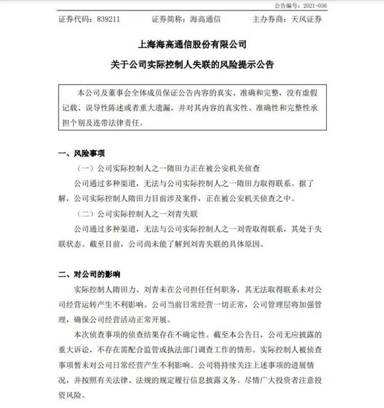 在这则“关于公司实际控制人失联的风险提示公告”中,海高通信称: