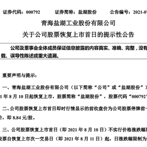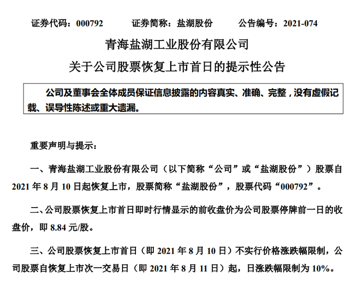 8月9日晚,*ST盐湖发布公告称,公司股票自2021年8月10日起恢复上市,股票简称“盐湖股份”。公告显示,*ST盐湖股票恢复上市首日的前收盘价为公司股票停牌前一日的收盘价,即8.84元/股。恢复上市首日不实行价格涨跌幅限制,次一交易日起日涨跌幅限制为10%。