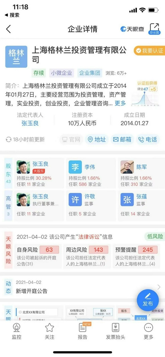 以张玉良为首的43个高管出资10万元共同成立一家管理公司,叫做上海格林兰投资管理有限公司。