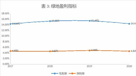 2020年绿地毛利率为14.41%,较2019年下降了近一个百分点;2020年绿地净利率为4.64%,较2019年下降了近0.3个百分点。