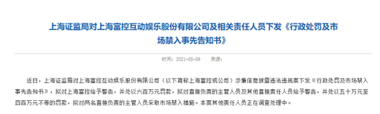 8月9日,上海证监局官网披露,近日,上海证监局对上海富控互动娱乐股份有限公司(以下简称上海富控或公司)涉嫌信息披露违法违规案下发《行政处罚及市场禁入事先告知书》,拟对上海富控给予警告,并处以六百万元罚款,拟对直接负责的主管人员及其他直接责任人员给予警告,并处以五十万元至四百万元不等的罚款,拟对两名直接负责的主管人员采取市场禁入措施。本案其他责任人员正在调查处理中。(退市富控维权入口)