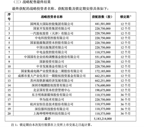 《国际金融报》记者注意到,根据中国电信披露的战略配售结果,20家战略投资者中,“最为慷慨”的当属成都市重大产业化项目一期股权投资基金有限公司以及苏州高铁新城经济发展有限公司,获配股数均为6.62亿股,其次是中国国有企业结构调整基金股份有限公司,获配5.52亿股,华为技术有限公司、国家开发投资集团有限公司、一汽股权投资(天津)有限公司等8家公司获配2.21亿股,排名第四。