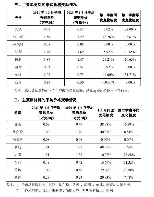 对于上半年主业利润大幅下降,三棵树在半年报中解释为原材料价格上涨而产品提价滞后所致。其产品主要原材料包括乳液、钛白粉、颜填料、助剂、树脂等,2021年以来多种原材料价格上涨明显,而主要原材料在成本中占比达到80%以上。