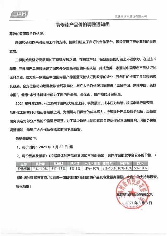 3月3日,三棵树宣布从2021年3月22日起上调旗下产品价格,其中乳胶漆上涨3%~10%;基辅材上涨5%~15%;艺术漆上涨3%-8%;水性木器漆上涨3%-10%;美丽乡村上涨3%-10%;胶粘剂上涨10%-18%;防水上涨5%-10%。