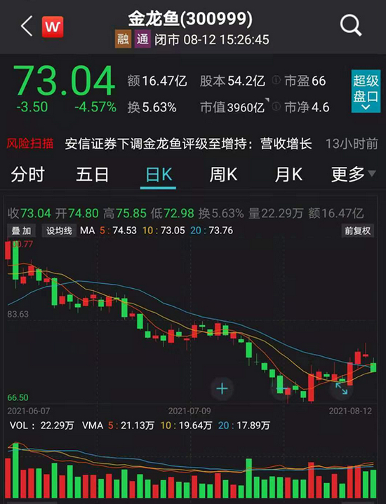 金龙鱼自2020年10月15日登陆创业板,随后一路上行,在2021年的1月11日创出145.51元的历史新高,最高市值约7887亿元。1月底以来,金龙鱼开启调整模式,在7月28日创出66.5元的年内新低,至此该股股价较历史高点已“腰斩”。
