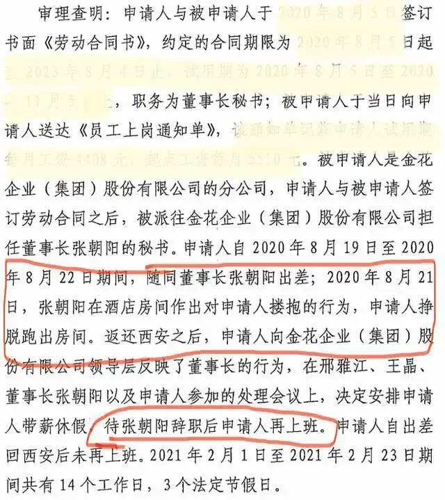 这份裁决书内容显示,“返回西安后,申请人向金花企业(集团)股份有限公司领导层反映了董事长的行为,在邢雅江、王晶、董事长张朝阳参加的处理会议上,决定安排申请人带薪休假,待张朝阳辞职后再来上班。”