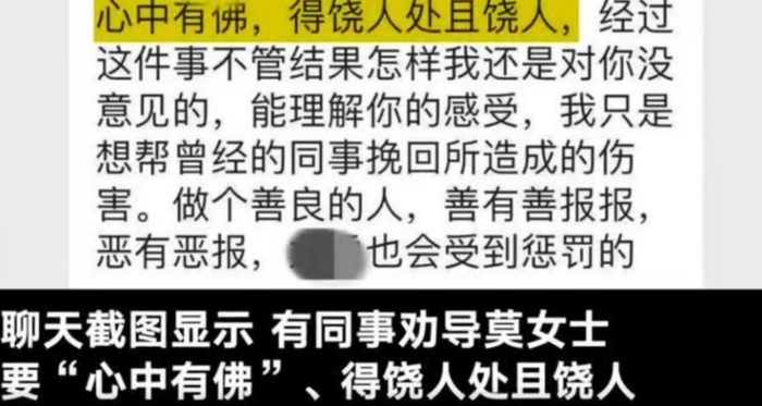 另一边,同事跑来劝说莫女士,心中要有佛,“得饶人处且饶人”。