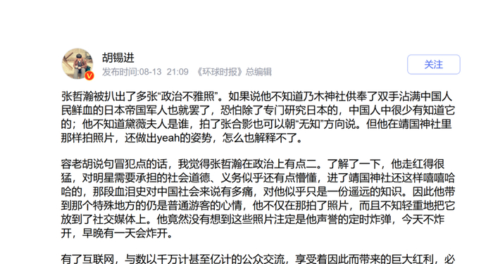 而《环球时报》总编辑胡锡进则表示,张哲瀚被扒出了多张“政治不雅照”。如果说他不知道乃木神社供奉了双手沾满中国人民鲜血的日本帝国军人也就罢了,恐怕除了专门研究日本的,中国人中很少有知道它的;他不知道黛薇夫人是谁,拍了张合影也可以朝“无知”方向说。但他在靖国神社里那样拍照片,还做出yeah的姿势,怎么也解释不了。