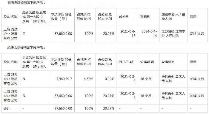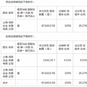 据此,上海鸿孜所持公司股份将被执行司法拍卖、变卖的数量为8766万股,占其所持有公司股份的100%,占公司总股本的20.27%。如届时前述股份全部被司法处置,将会导致公司控股股东、实际控制人发生变更,进而可能对公司生产经营、公司治理产生影响。