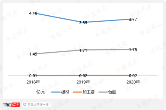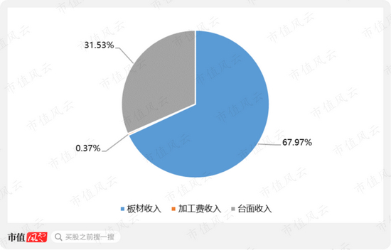 2020年,板材约贡献了中旗新材7成左右的营收,台面贡献了3成左右营收,此外还有零星的加工费收入。收取加工费的是台面加工服务,由子公司天津东弘家居石材制品有限公司负责,目前收入规模相对较低。
