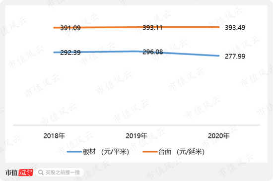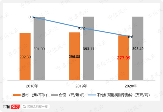 但随着主要原材料之一不饱和聚酯树脂价格持续下降,中旗新材人造石英石板材和台面的售价很稳定。2020年实在不好意思了,才把板材下调了6.11%,台面仍保持不变。要知道当年不饱和聚酯树脂平均采购价下滑了16.67%,如果以2018年为基数,下滑了31.03%。