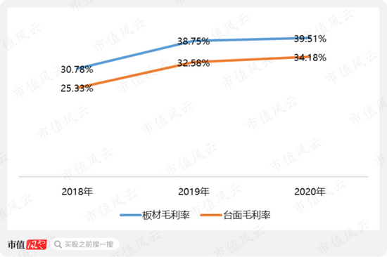 再加上市场上提供台面加工企业众多,中旗新材人造石英板材的毛利率反而每年要比人造石英台面多出5个百分点左右。