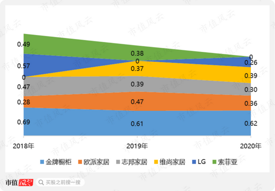 其中,金牌橱柜、欧派家居、志邦家具、LG、索菲亚及佛山维尚家具制造有限公司(以下简称“维尚家居”)是中旗新材过去3年前5大客户。收入贡献稳中略降是前5大客户的共同特征,其中,以索菲亚和LG最为明显。
