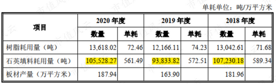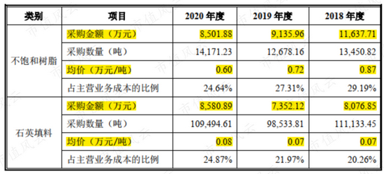 虽然过去三年,不饱和树脂的采购金额与石英填料相差不大,但石英填料由于价格便宜,采购数量约为不饱和树脂的10倍左右,近三年的耗用量也基本维持在10万吨上下。
