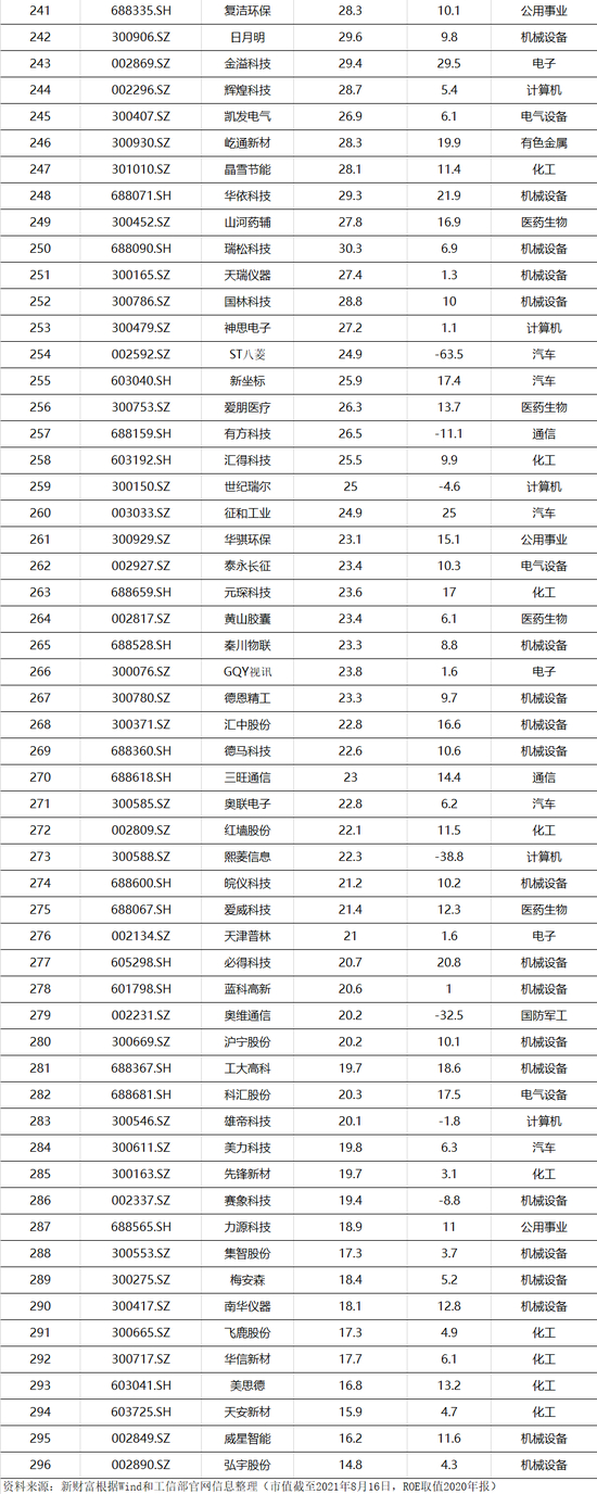 截至8月17日收市, 296家专精特新上市公司的总市值为28348亿元,平均市值95.8亿元,但中位数市值只有55.3亿元。