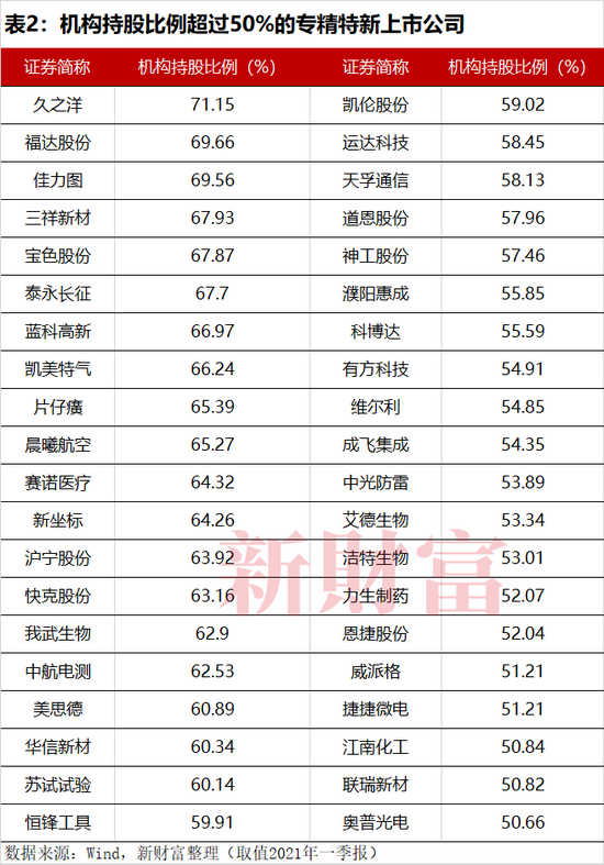 2021年一季度末,机构平均持股专精特新公司的比例为23.26%,中位数为17.29%,并有40家公司的机构持股占比超过50%。其中,机构持股久之洋(300516)超过7成,福达股份(603166)和佳力图(603192),机构持股比例也接近70%。