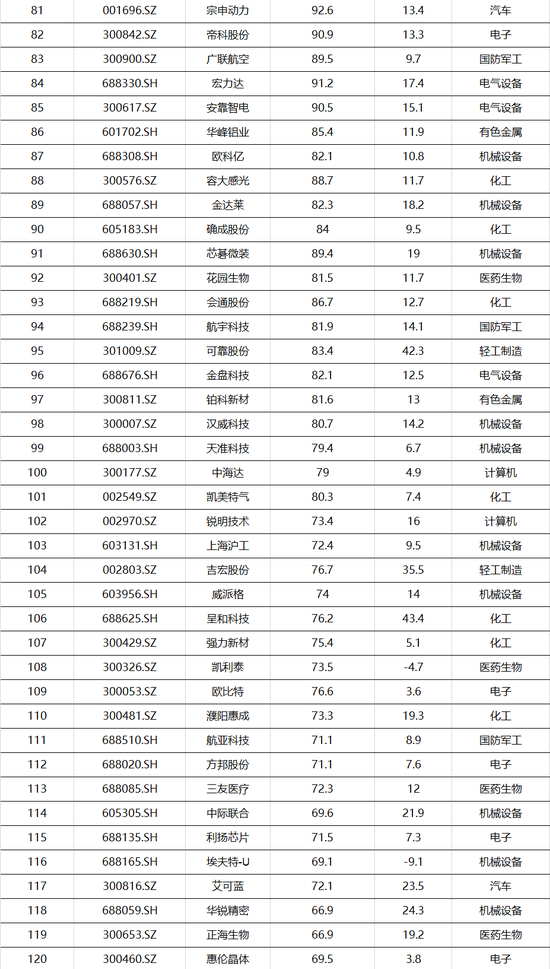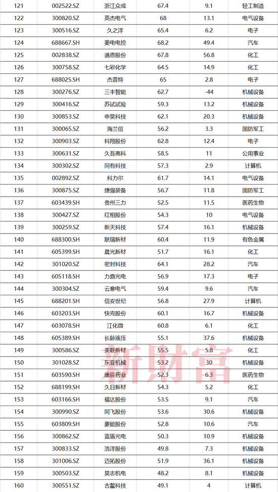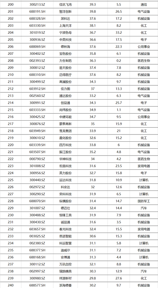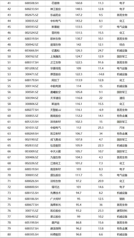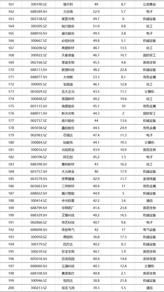 其他行业上榜数量超过两位数的还有:计算机(17家)、汽车(16家),国防军工(15家)、有色金属(14家)。此外,公用事业(7家)、通信(7家)、家用电器(4家)、轻工制造(3家)、建筑装饰(1家)、建筑材料(1家),农林牧渔(1家)、综合(1家)、钢铁(1家)。