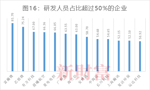 研发人员占比超过50%的专精特新公司共计13家(图16),前三是富瀚微(300613)、芯朋微(688508)、有方科技(688159),研发人员占比分别为81.7%、75.2%、67%。