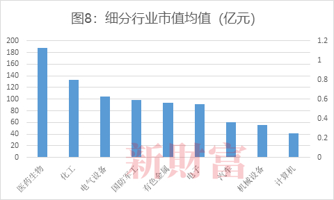 化工行业公司的市值平均为133.34亿元,并有5家公司市值超过200亿元。化工公司比生物医药公司多14家,但生物医药公司总市值6373亿元,却几乎与化工行业公司的总市值6400亿元持平。