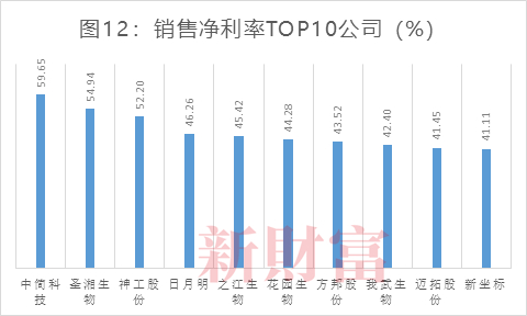共计有35家公司的销售净利率超过30%,其中12家超过40%(图12),并有3家公司超过50%,即中简科技(300777)59.65%,圣湘生物54.94%,神工股份(688233)52.2%。销售净利率超过20%共计96家。