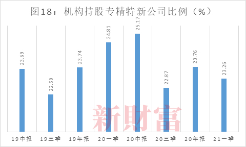 作为对比,截至2021年一季度末,机构在科创板公司的持股比例平均为21.86%,创业板公司为24.02%。专精特新上市公司的机构持股比例略高于创业板和科创板整体水平。据WIND数据,最近8个季度,机构配置专精特新公司的比例都保持在20%以上(图18)。