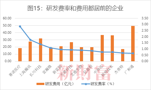 研发费用超过1亿元、研发费率超过10%的“双高”专精特新公司,共有12家(图15),并有3家研发费用超过2亿元,即广和通、中海达和锐明技术(002970),研发费用分别为2.88亿元、2.15亿元、2.11亿元,研发费率分别为11.1%、13.2%、13.1%。