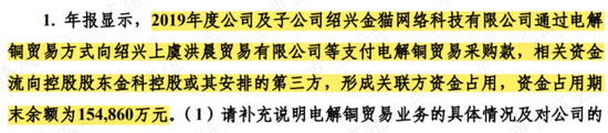 根据年报披露,金科文化子公司通过电解铜贸易方式,向上游支付电解铜贸易采购款,相关资金流向控股股东金科控股或其安排的第三方,形成关联方资金占用。