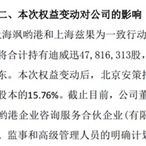 迪威迅表示,公司现任董事会的六位董事全部为北京安策提名,上海飒哟港及一致行动人暂未有调整上市公司董事、监事和高级管理人员的明确计划,上市公司的实际控制人未发生变更。