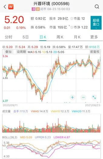 兴蓉环境今日早盘小幅高开后,成交并没有明显放大,此后略有回调,最终收涨0.19%。