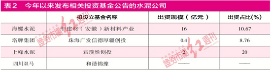 实际上,把未来业绩的新增长点放在投资收益上的水泥公司也有多家。如前述塔牌集团,公司于3月23日发布《关于与专业机构合作成立投资基金的公告》称,为提升塔牌集团的对外投资能力和提高投资效益,塔牌创投(塔牌集团全资子公司)与广发信德投资管理有限公司等设立珠海广发信德厚疆创业投资基金(有限合伙)(见表2)。此外,据塔牌集团今年半年报显示,公司在报告期内实现投资收益1.04亿元。并在“非主营业务分析”一览中标注“理财产品收益具有较大可能的可持续性。”但实际上,塔牌集团去年同期的投资收益为1.07亿元,今年同比下滑2.8个百分点。