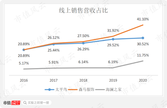 2016-20年,太平鸟线上销售占比从20.98%上升至30.52%,一直高于海澜之家,但已与森马服饰拉开差距。