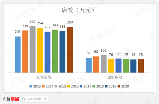 2020年加盟店效与2019年持平,而直营店效大幅增长。