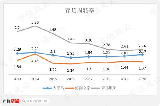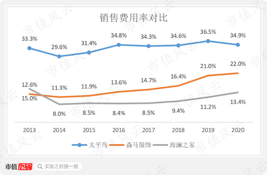2016年至今,太平鸟的销售费用率一直维持在35%左右的高水平,而森马服饰和海澜之家的销售费用率虽持续上升,2020年也分别仅为22%和13%。