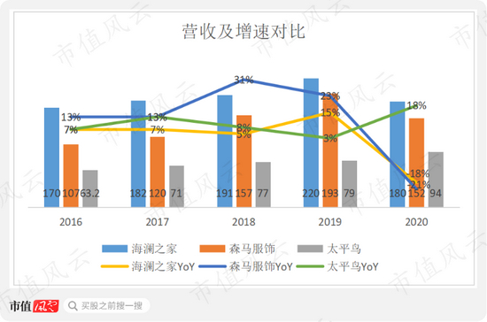 从营收规模来看,海澜之家最大,接近200亿,太平鸟最小,未及100亿,森马服饰居中。