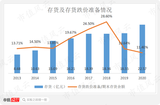 2015-18年,公司的存货跌价准备/期末存货余额的比例不断攀升,从13.85%上升为28.60%,2018年达到最高。